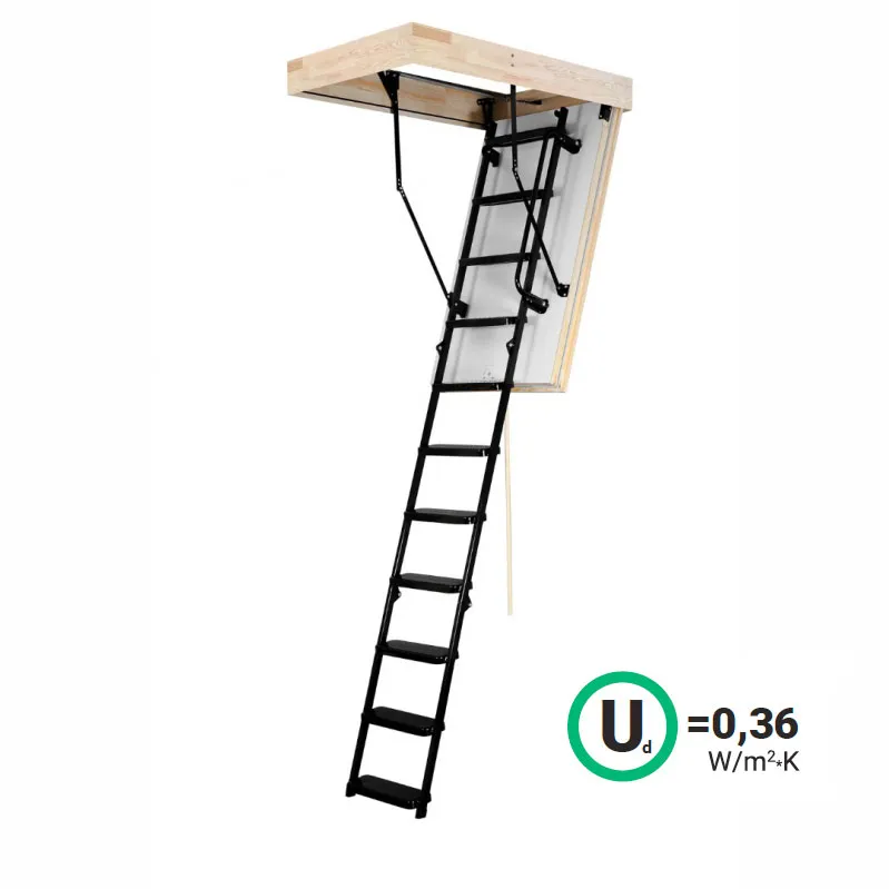 Лестница LMS представляет собой удобную складную конструкцию из металлического лестничного марша и термоизоляционной крышки люка. Контур уплотнения, установленный по периметру крышки, обеспечивает высокую степень герметичности и сохраняет тепло в помещении.