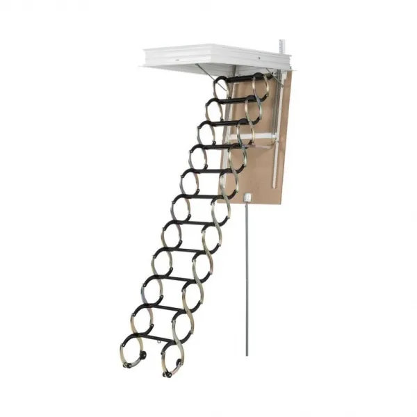 Складная 4-х секционная чердачная лестница. Рабочая поверхность полностью выполнена из алюминия. Термоизоляционная крышка типа "сэндвич" имеет усиленную теплозащиту, облицована с двух сторон ДВП белого цвета. По контуру короба имеется уплотнитель; Все металлические элементы лестницы покрыты порошковой краской.