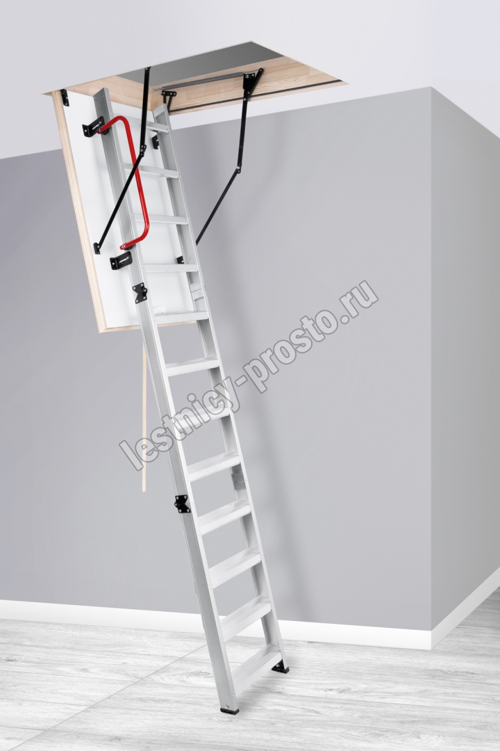 Складная 3-х секционная чердачная лестница. Рабочая поверхность полностью выполнена из алюминия. Термоизоляционная крышка типа "сэндвич" имеет усиленную теплозащиту, облицована с двух сторон ДВП белого цвета. По контуру короба имеется уплотнитель; Все металлические элементы лестницы покрыты порошковой краской.