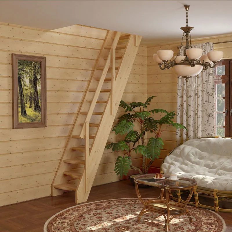Удобная лестница на косоурах с поворотом на 90 градусов. Открытые ступени визуально облегчают конструкцию. Ограждения по всему маршу обеспечивают дополнительную безопасность и возможность декорирования. Монтаж осуществляется силами двух человек на объекте по указаниям, приведенным в паспорте на лестницу.