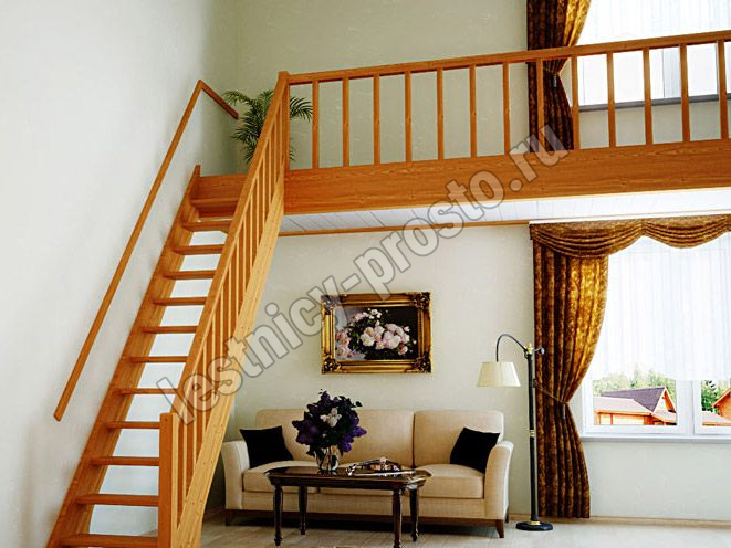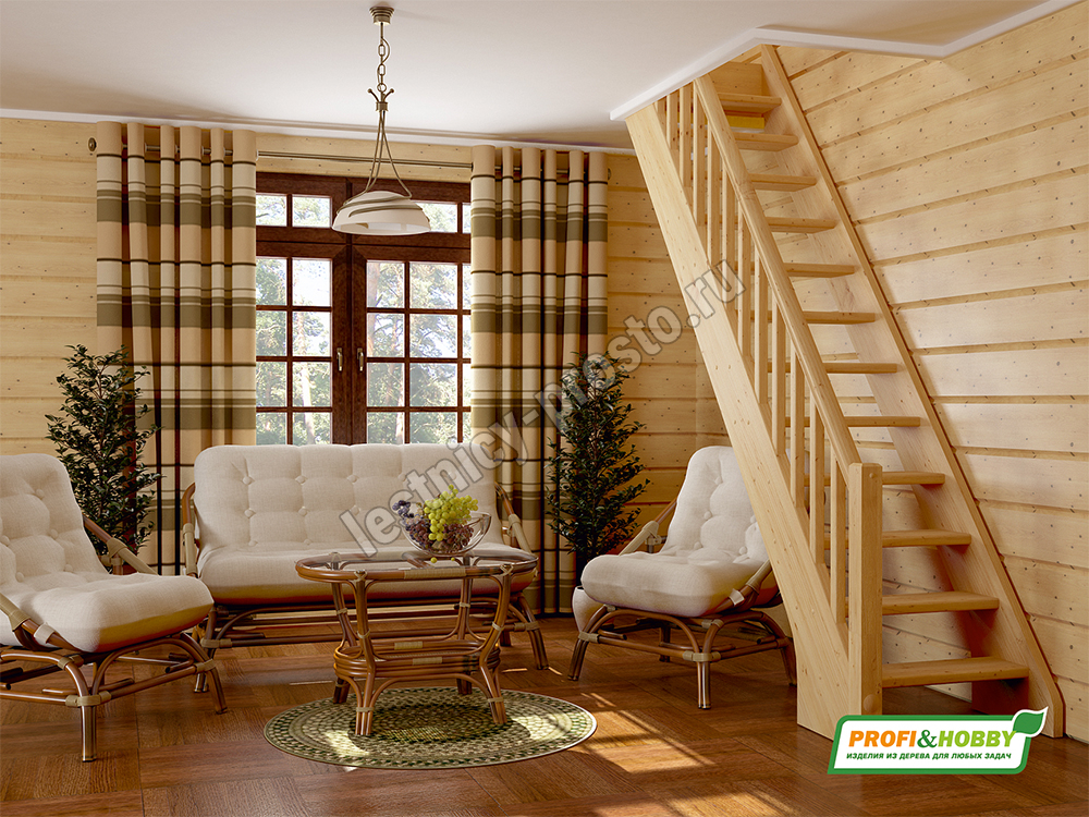 Ступени и поручень лестницы изготовлены из ясеня, остальные элементы из сосны.