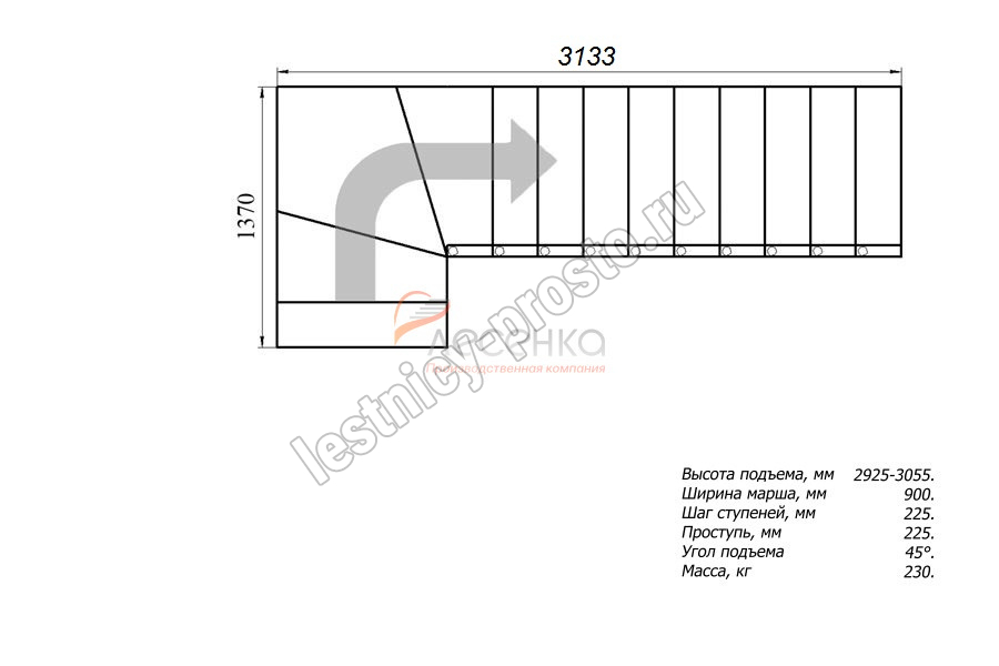 Модульная лестница Фаворит 225 2925-3055, Серый, Лиственница, Нержавеющая сталь